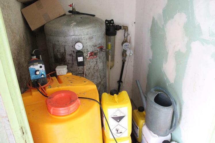 Pour se mettre en conformité avec les exigences de leur laiterie, le Gaec a installé en 2018 un système de traitement de l’eau comprenant une pompe doseuse, un bac tampon, ainsi qu’un système de filtration pour protéger les équipements. La pompe doseuse injecte une solution chlorée dans le bac, assurant ainsi une désinfection durable du circuit d’eau.